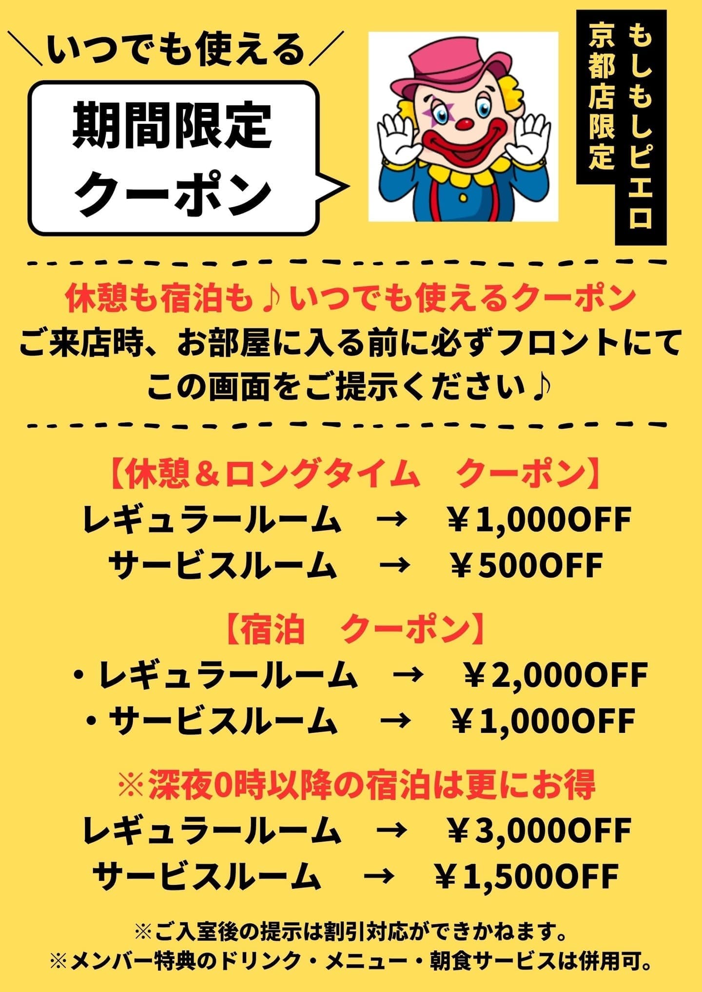 ※ご来店後、1階パネルにてお部屋をお選びいただいた後、フロントにて必ずこちらのクーポン画面をスタッフにお見せ下さい。